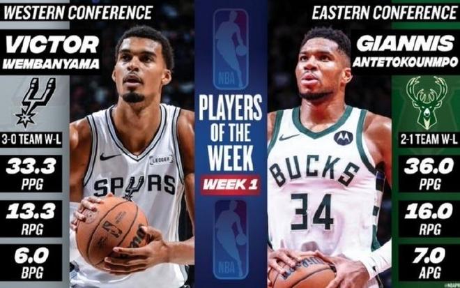 NBA官方宣布,字母哥和文班亚马分别当选了东西部第一周的周最佳球员。这也是没有任何质疑的,在第一周两人的表现十分强势,字母哥场均轰下36分16篮板7助攻,带领雄鹿取得2胜1负的成绩;文班亚马则场均轰下33.3分13.3篮板6封盖,带领马刺取得3胜0负的战绩。此外,库里、东契奇、亚历山大、马克西、布伦森等人获得了提名。